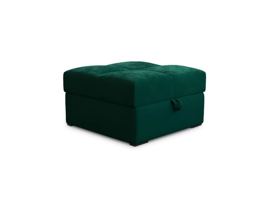 kronos 19Moderní taburet s úložným prostorem v tmavě zelené – skvěle ladí s dřevem a kovovými prvky.