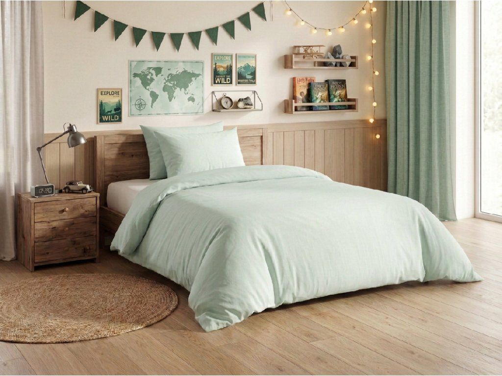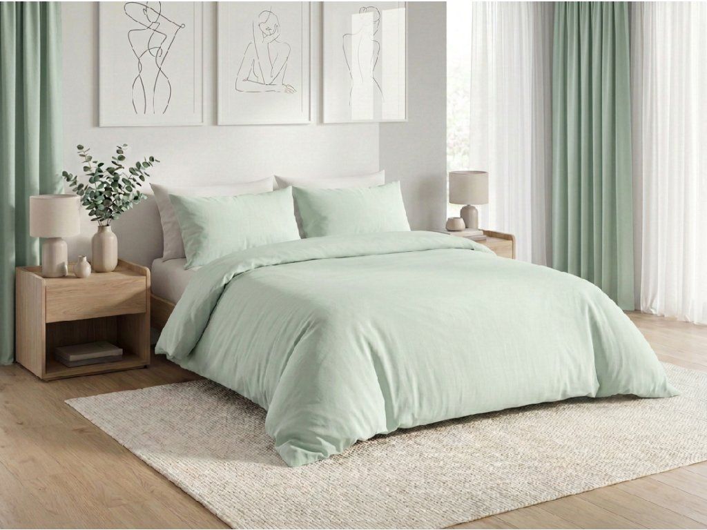 Baumwoll-Bettwäsche CALMORA mint bringt Frische, Leichtigkeit und ein Gefühl von Reinheit ins Schlafzimmer. Dieser sanfte grünliche Ton wirkt beruhigend und erinnert an frische Morgenluft. Die mint Farbe erhellt den Raum und schafft eine harmonische Umgebung, ideal für Entspannung und ruhigen Schlaf.