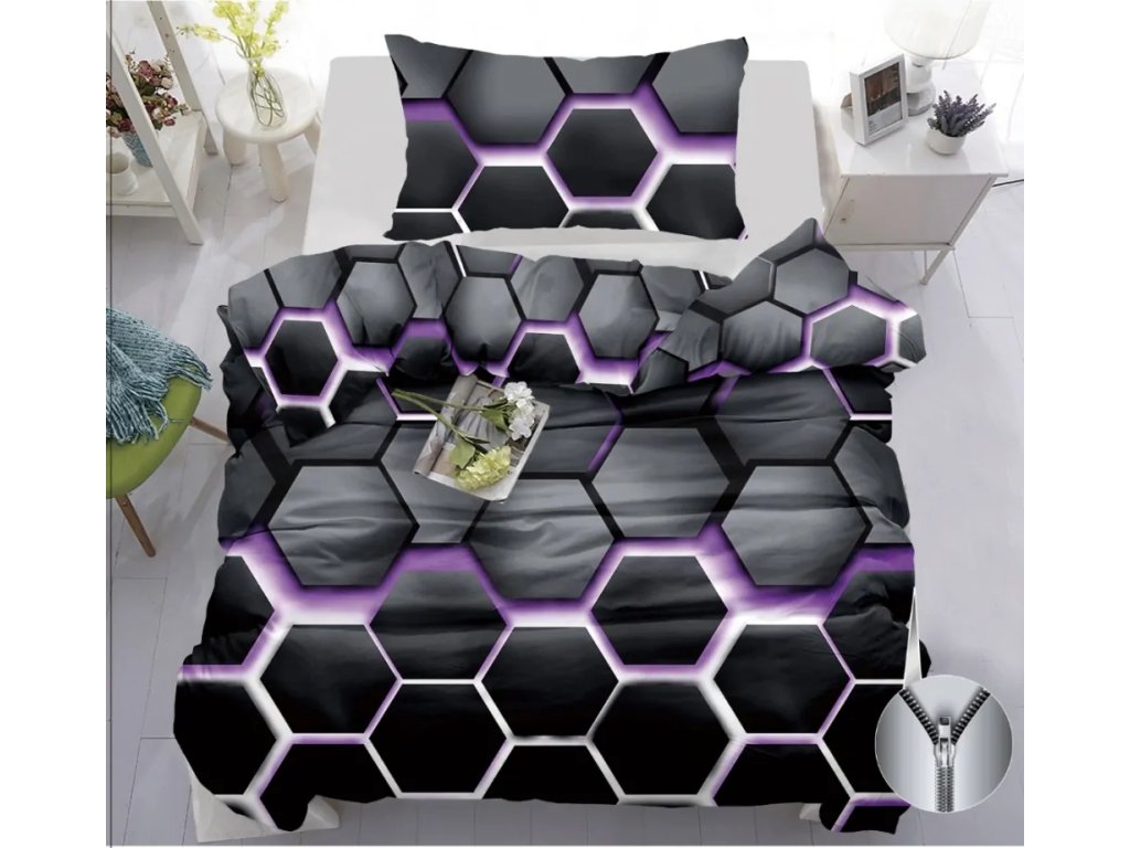 Hochwertige Baumwollbettwäsche ist wegen ihrer Weichheit, hohen Saugfähigkeit und Atmungsaktivität sehr beliebt. Der moderne Stil mit geometrischem Motiv verwandelt garantiert jedes Schlafzimmer. Sie werden sich auch in den schwarzen Hintergrund in Kombination mit weißen und violetten Details, dem originellen Design und dem weichen Stoff verlieben.