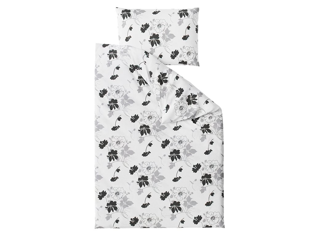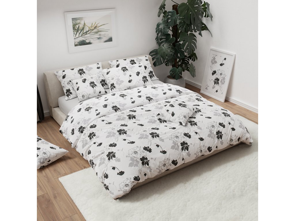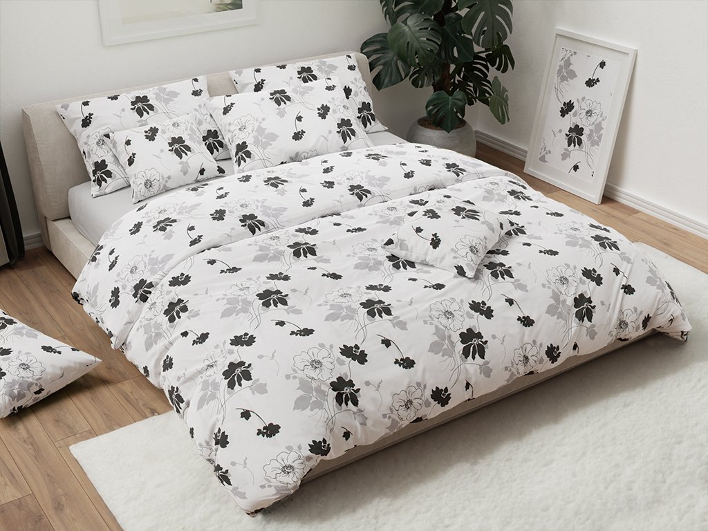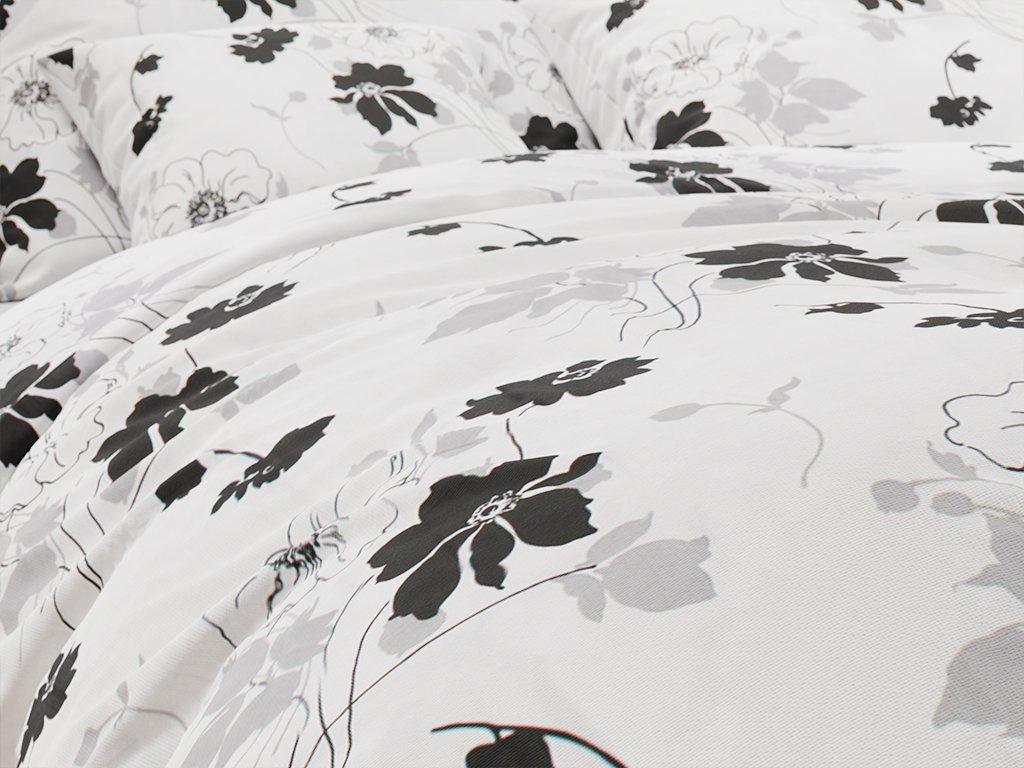 Hochwertige Baumwollbettwäsche ist wegen ihrer Weichheit, hohen Saugfähigkeit und Atmungsaktivität sehr beliebt. Der Landhausstil mit Blumenmotiv verwandelt garantiert jedes Schlafzimmer. Der weiße Hintergrund in Kombination mit schwarzen und grauen Details, das originelle Design und der weiche Stoff werden auch Sie zum Verlieben bringen.