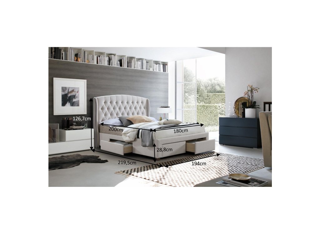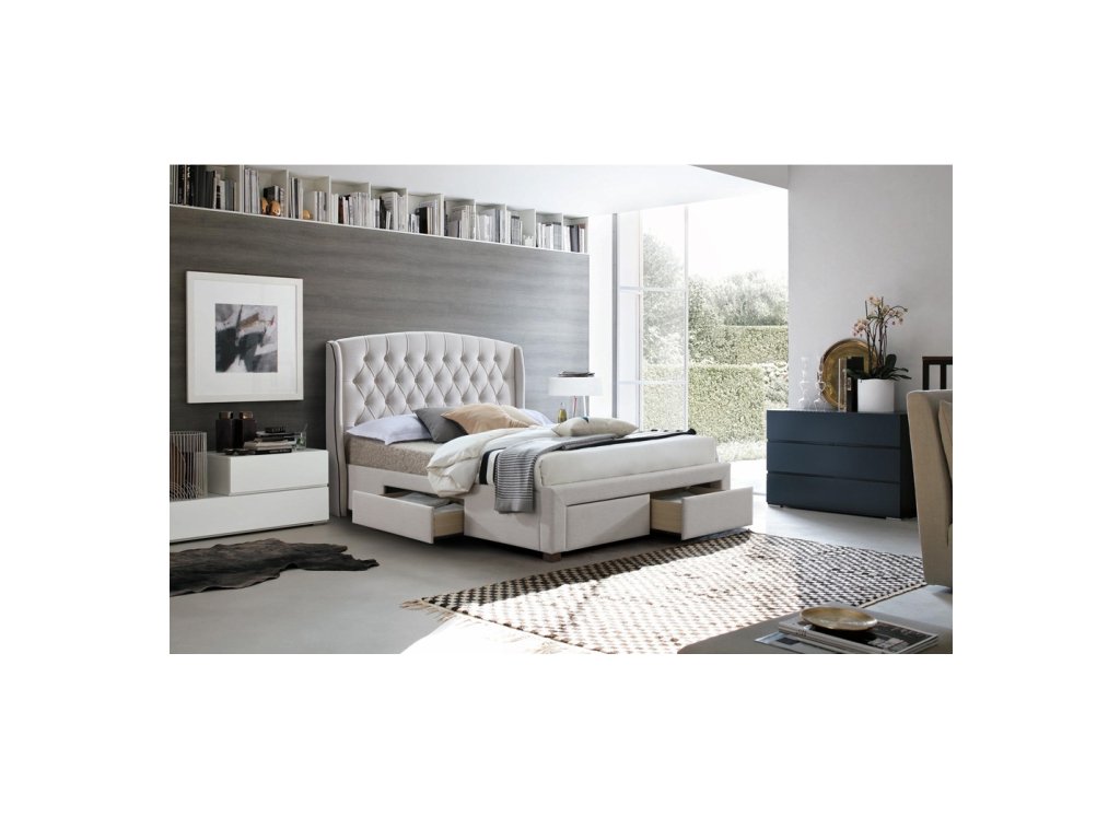 Cremfarbenes Bett mit Stauraum AKANA 180 x 200 cm