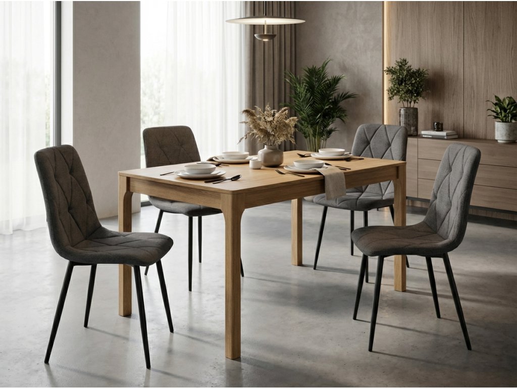 Ein Stil, der einfache Formen und hohe Funktionalität verbindet. Setzen Sie auf dezente Accessoires, eine feine Farbpalette und natürliche Materialien. Hervorragende Ergänzungen für ein skandinavisches Esszimmer sind immergrüne Pflanzen, farbenfrohe Tischsets und große Metalllampen. Der skandinavische Innenraum benötigt große Fenster und Beleuchtung, die auch an kurzen Tagen für Licht sorgt. Der gepolsterte Esszimmerstuhl Libra fügt sich perfekt in ein von skandinavischen Ländern inspiriertes Esszimmer ein. Verschiedene Farben von Stühlen an einem Tisch sehen großartig aus. Haben Sie keine Angst vor Veränderung.