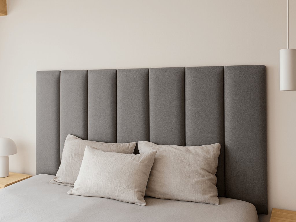Gepolstertes Wandpaneel QUADRATTA im Maß 15 x 60 cm besticht durch ein einfaches, aber durchdachtes Design und praktische Einsatzmöglichkeiten. Weiche Polsterung und hochwertiger Stoffbezug in neutralem Grau machen es zu einem großartigen Accessoire nicht nur für das Schlafzimmer, sondern auch für das Kinderzimmer. Dank der stabilen Basis hält das Paneel fest an der Wand und bietet Komfort und Schutz – ideal als weiches Bettkopfteil oder sichere Stütze für Kinderbereiche.
