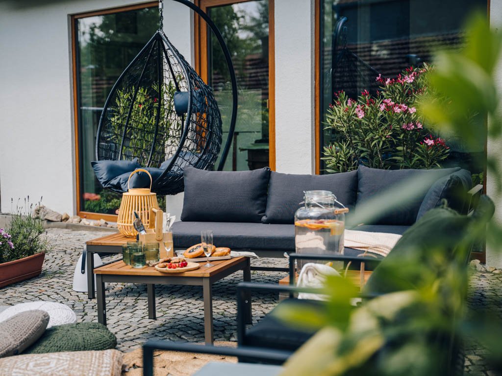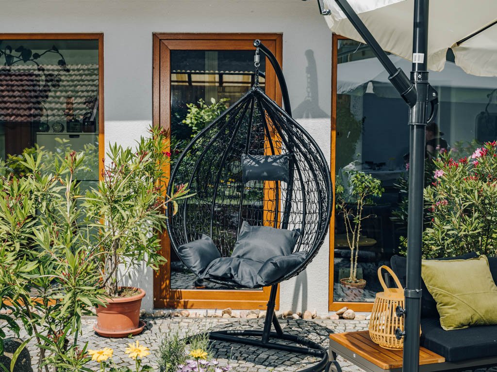 - Wenn Sie den Ständer zur Aufhängung des Sessels verwenden, stellen Sie ihn auf eine ebene und feste Oberfläche, wo er stabil steht (z.B. Boden, geflieste Terrasse).
