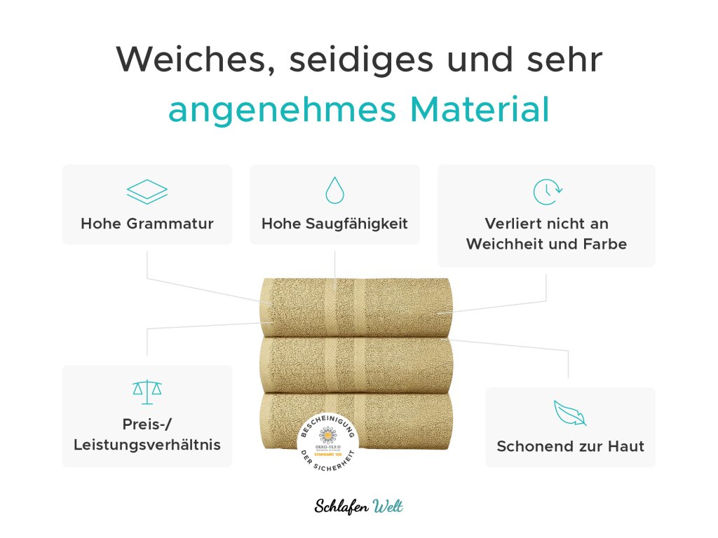 Eine der wichtigsten Eigenschaften von Handtüchern ist sicherlich ihre Weichheit. Beliebte Stoffe aus Baumwolle, Bambus oder einer Kombination aus beidem sind weich und sanft. Schlaufengewebe sind dreidimensionale Gewebe, bei denen die dritte Dimension aus Schlaufen besteht, die sich unter oder über der Oberfläche des Grundgewebes befinden. Mit zunehmendem Gewicht des Gewebes steigt die Qualität des Produkts unmittelbar an. Das Handtuch ist weicher und flauschiger.