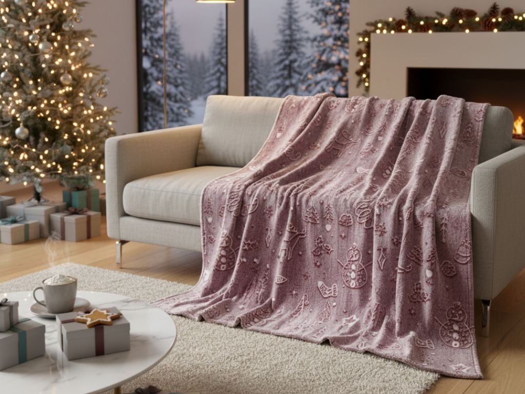 Leuchtende weihnachtliche Mikroplüsch-Decke PAINTY CHRISTMAS, weinrot