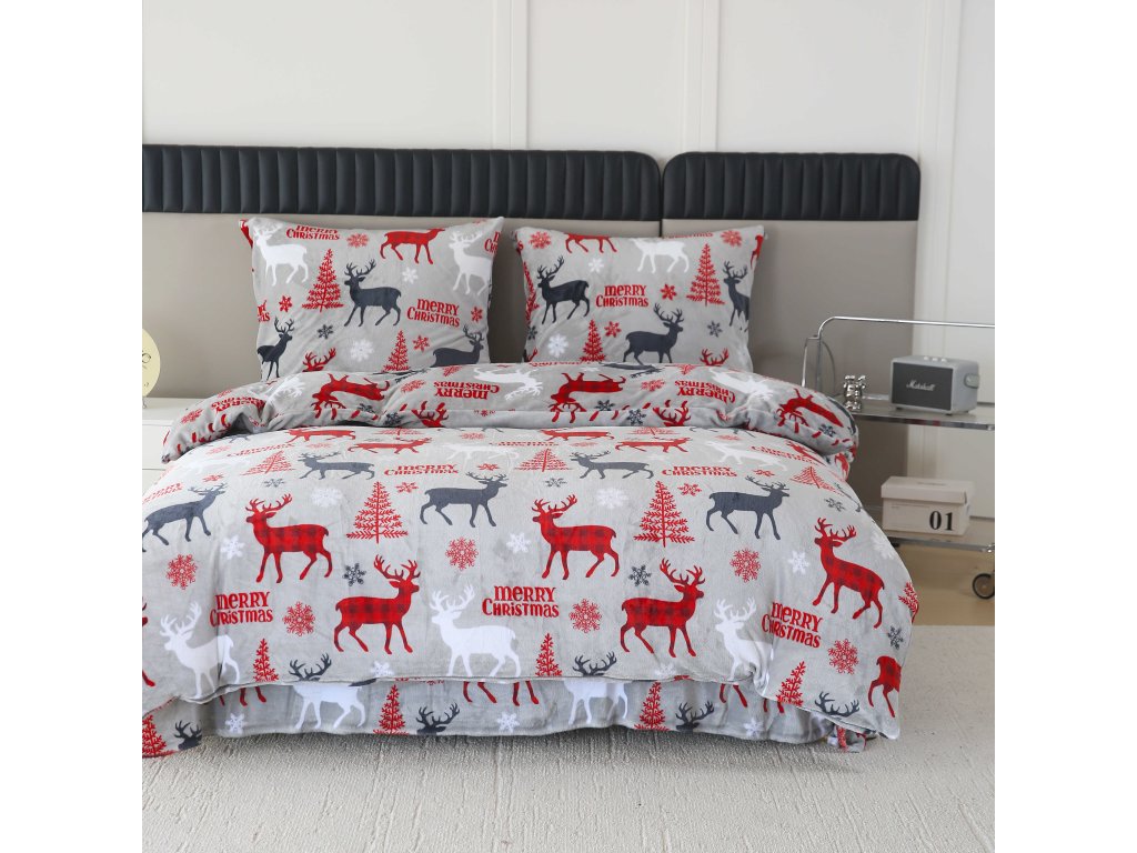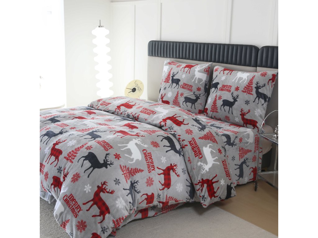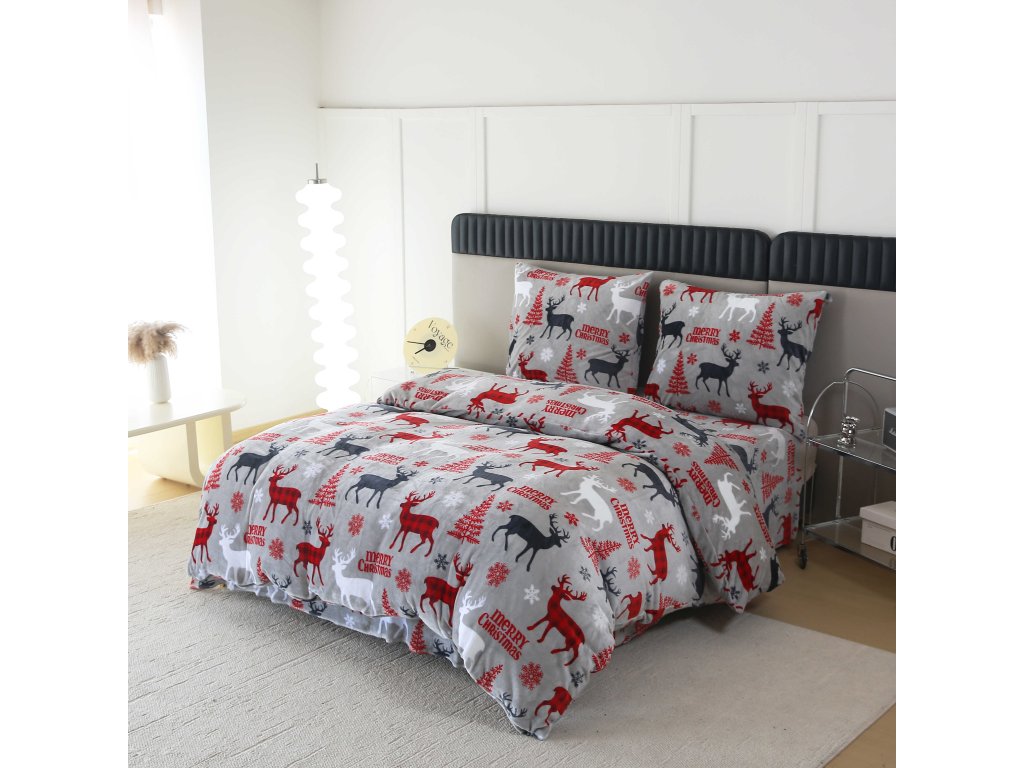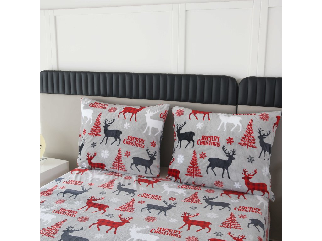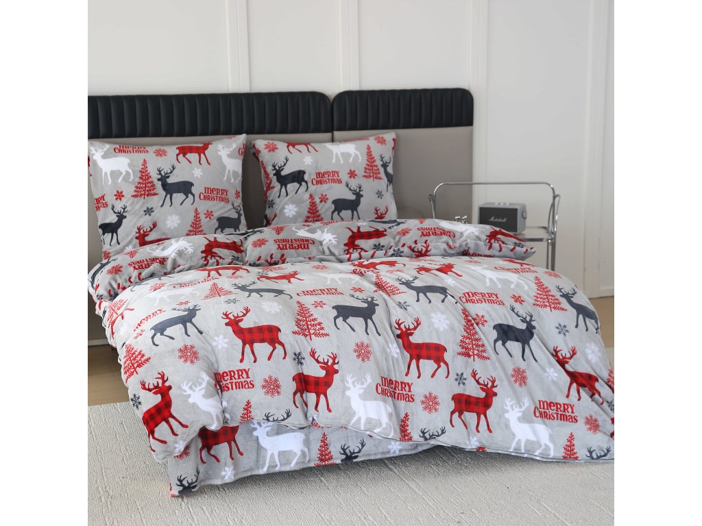 Mikroplüsch-Bettwäsche-Set MERRY CHRISTMAS DEER grau + Mikroplüsch-Spannbettlaken SOFT 180x200 cm weiß, Doppelbett