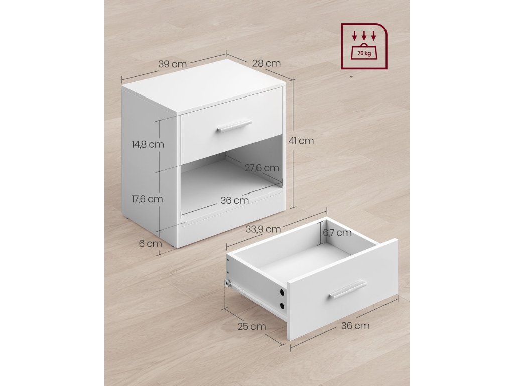 Der Nachttisch CLARIO in Weiß kombiniert ein einfaches Design mit praktischer Anordnung. Dank der Schublade und des offenen Fachs bietet er ausreichend Stauraum für Ihre Bücher, Lampe oder weitere Utensilien. Das frische weiße Dekor und die kompakten Maße machen ihn zur idealen Wahl für das Schlafzimmer und Wohnzimmer. Eine Tragfähigkeit von bis zu 75 kg gewährleistet seine Robustheit und dank seines universellen Aussehens passt er sich leicht jedem Interieur an. Dieser Tisch ist die perfekte Lösung für diejenigen, die Funktionalität mit einem eleganten Touch suchen.