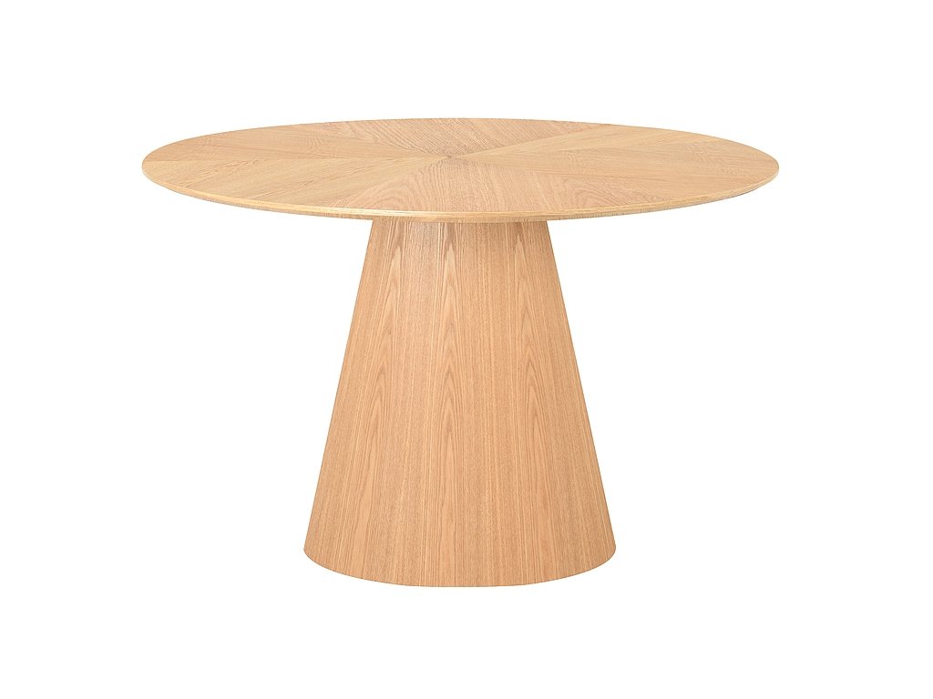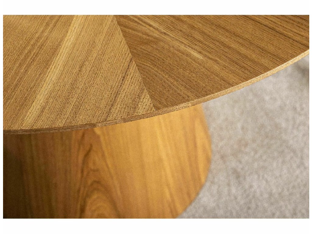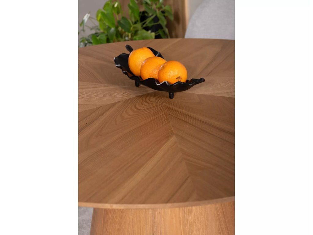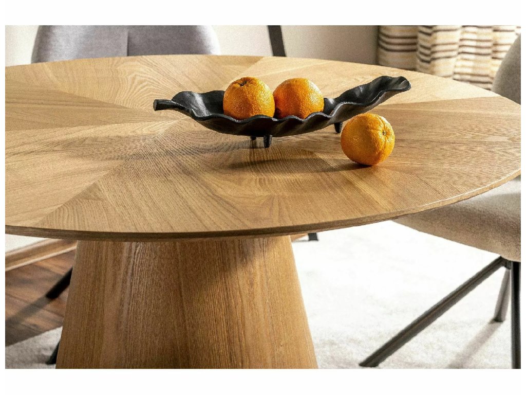 Bringen Sie Stil und natürliche Schönheit in Ihr Esszimmer mit diesem runden Tisch mit zentralem Untergestell. Dank klarer Linien, Eiche-Dekor und stabiler Konstruktion wird er nicht nur zu einem praktischen, sondern auch visuell attraktiven Element in jedem Interieur. Die runde Form unterstützt bequemes Sitzen und Kontakt zwischen allen Personen am Tisch. In Kombination mit verschiedenen Arten von Stühlen schaffen Sie leicht einen gemütlichen und funktionalen Ort für alltägliche Mahlzeiten sowie besondere Momente.