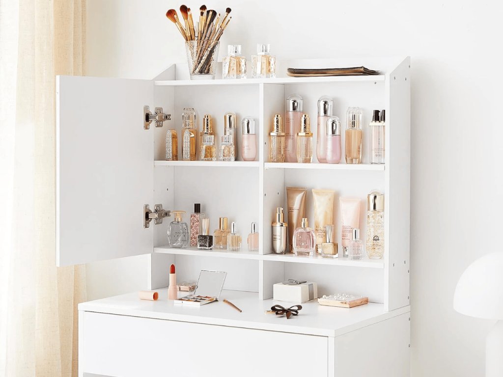 Der Schminktisch mit Spiegel wird Ihr täglicher Verbündeter bei der morgendlichen Vorbereitung und abendlichen Hautpflege. Dank der cleveren Aufteilung des Stauraums haben Sie alles Wichtige immer griffbereit – von Kosmetik bis Schmuck. Sein klares und elegantes Design fügt sich leicht in jedes Interieur ein, egal ob Sie den Raum romantisch oder minimalistisch gestalten. Verwandeln Sie die tägliche Routine in ein angenehmes Ritual und gönnen Sie sich einen Raum, in dem Sie sich entspannen und ganz Sie selbst sein können.