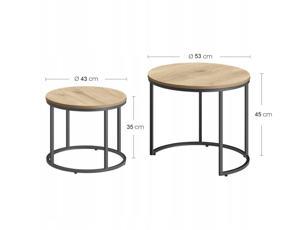 Zwei runde Tische in verschiedenen Größen bieten variable Nutzungsmöglichkeiten – Sie können sie einzeln platzieren oder den kleineren Tisch unter den größeren schieben und so Platz sparen. Stabile Metallbeine sorgen für Festigkeit und Haltbarkeit der Konstruktion, während die hochwertige Oberflächenbehandlung der Platten deren Pflege erleichtert.