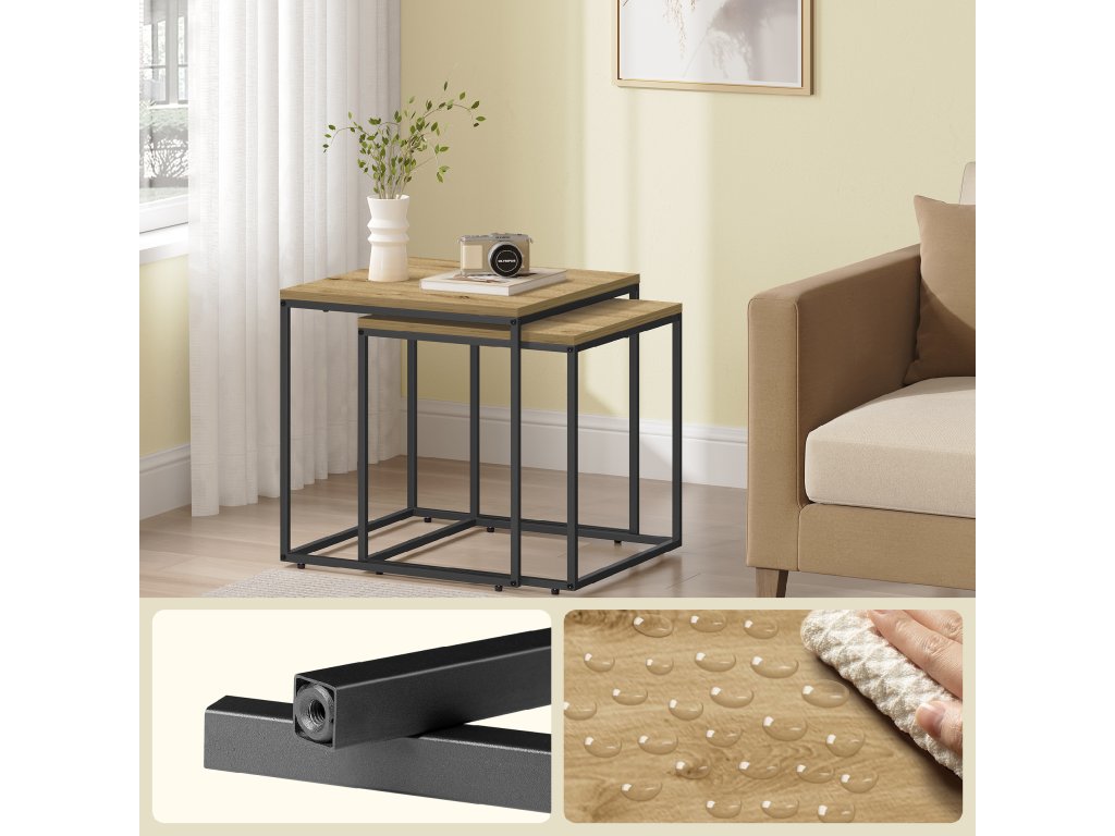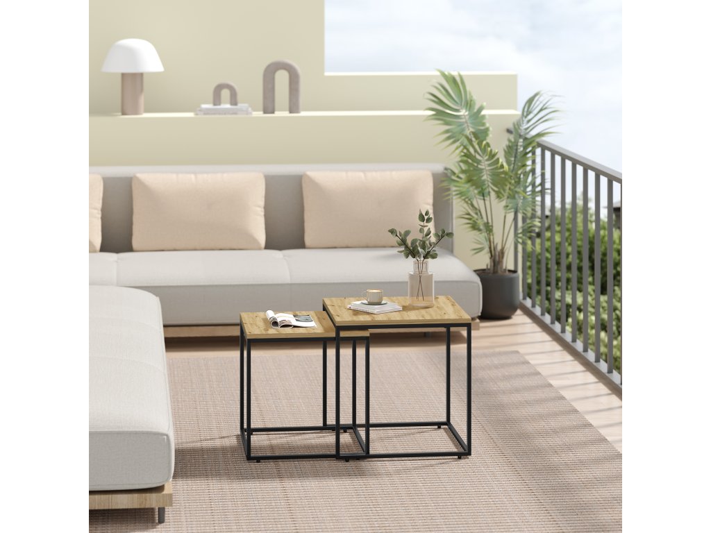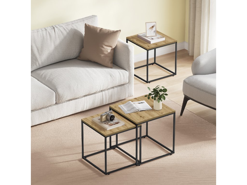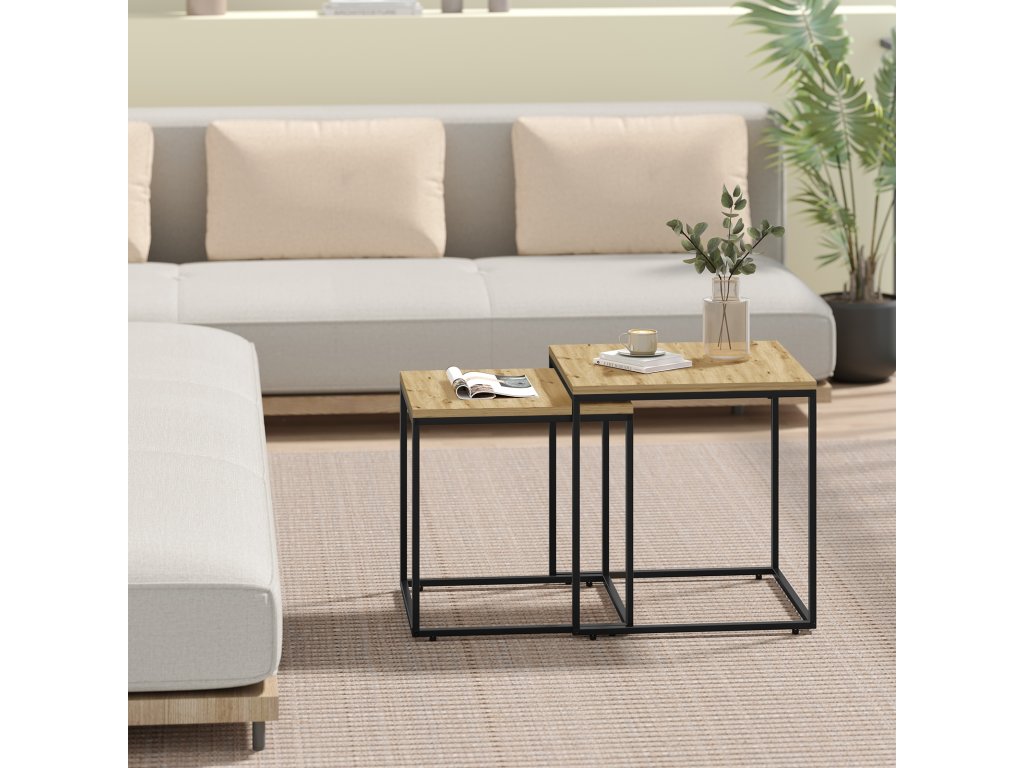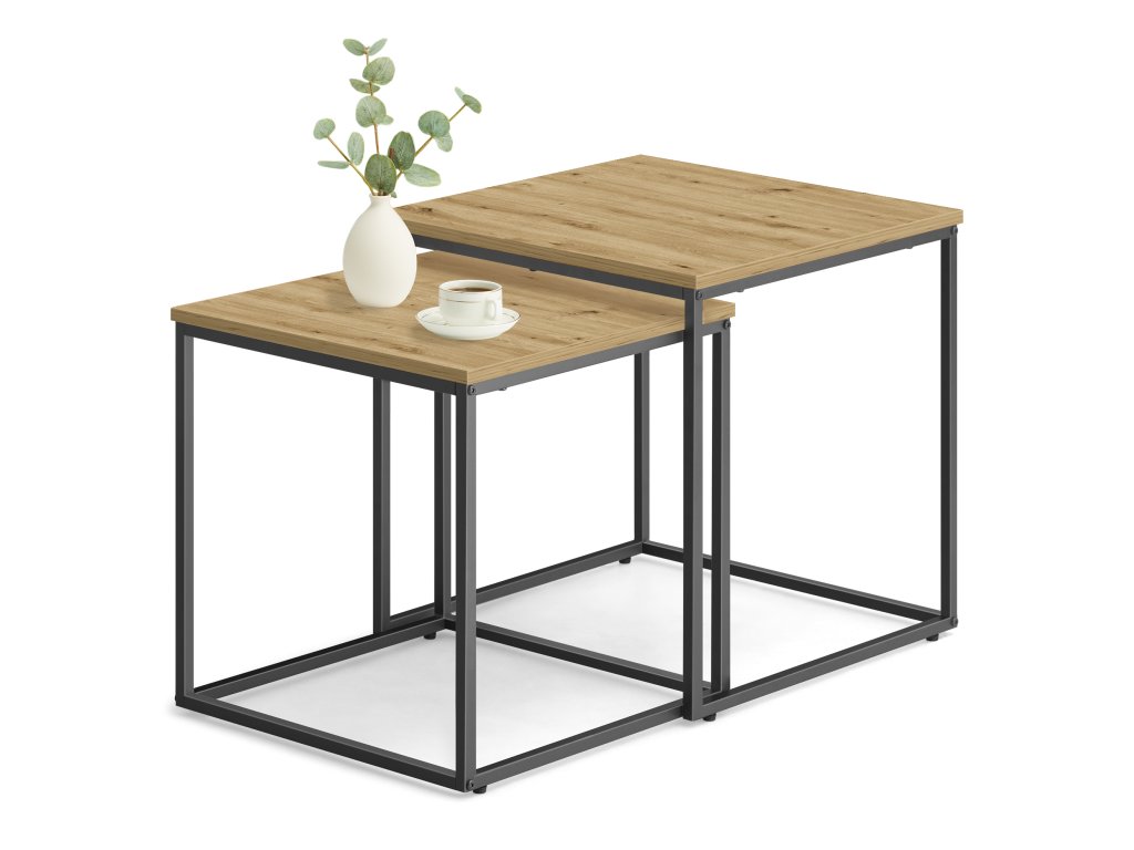 Dieses Set aus zwei Tischen bietet eine großartige Kombination aus Stil und Funktionalität, die in jedem Haushalt geschätzt wird. Der kleinere Tisch lässt sich leicht unter den größeren schieben, was eine ideale Platzsparlösung für kleinere Räume ist. Im Wohnzimmer können sie als Couchtische verwendet werden, wobei der kleinere Tisch für Getränke oder Fernbedienungen genutzt werden kann, während der größere Platz für Dekorationen oder Bücher bietet. Im Schlafzimmer können sie als Nachttische verwendet werden, mit ausreichend Platz für eine Lampe, Bücher und andere Notwendigkeiten. Dank ihres einfachen, aber eleganten Designs im Dekor Eiche Artisan und schwarzem Stahl lassen sie sich leicht mit jedem Interieur kombinieren. Außerdem können Sie ihr Aussehen mit Accessoires wie Vasen, Kerzen oder Aufbewahrungsorganisatoren für Kleinigkeiten auffrischen. Mit diesen Tischen schaffen Sie nicht nur einen funktionalen Raum, sondern auch eine gemütliche Ecke, die zum Entspannen und Wohlfühlen einlädt.