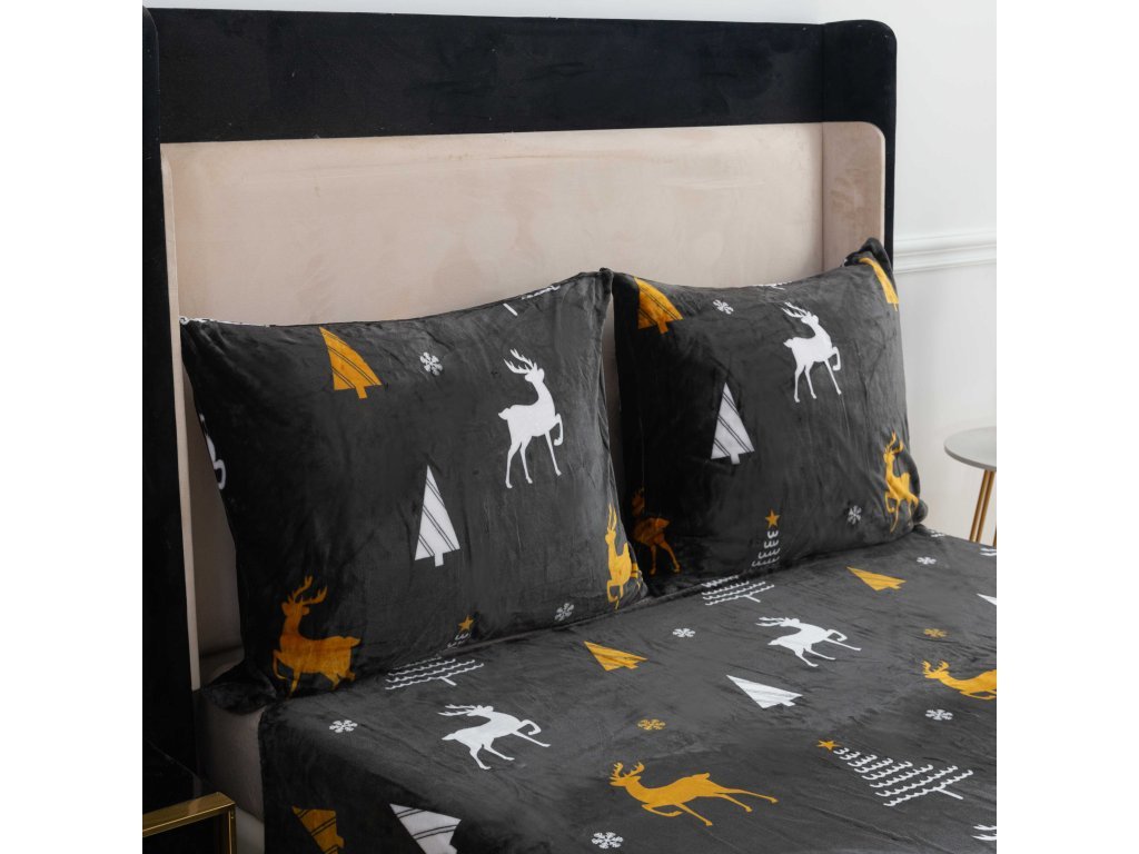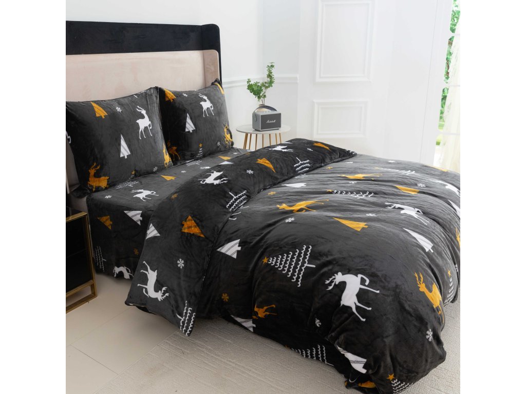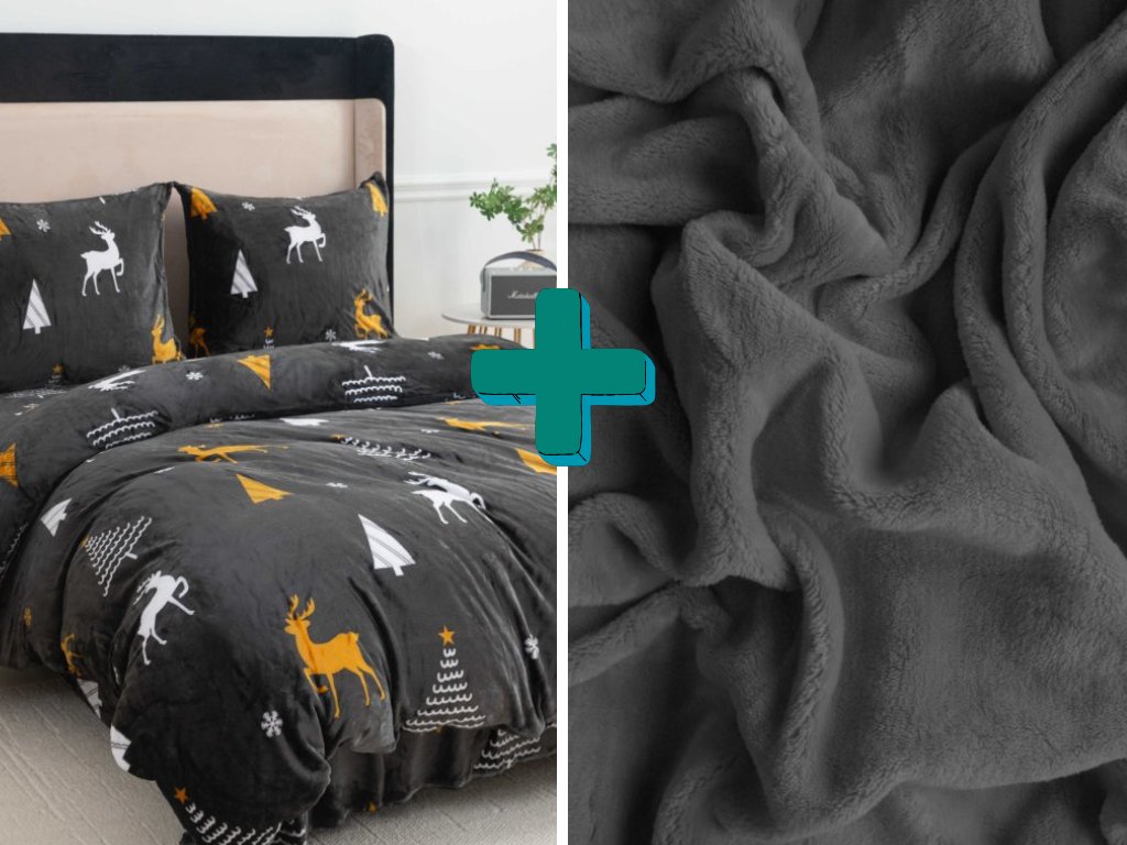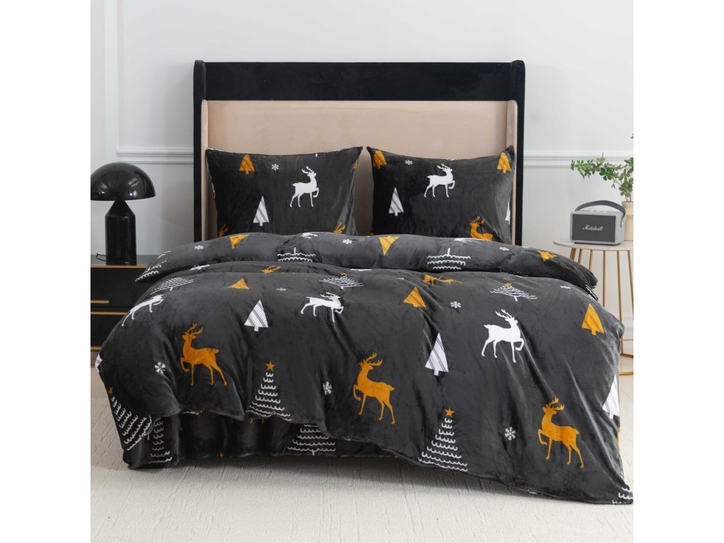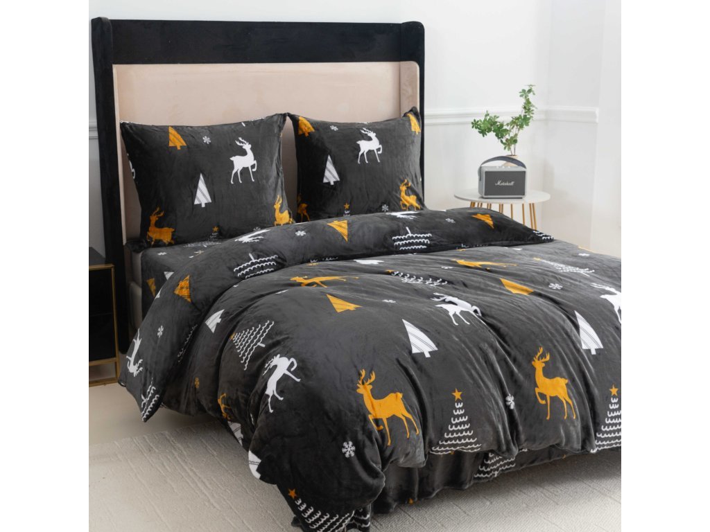 Schaffen Sie eine maximal komfortable und gemütliche Umgebung für Winterabende mit diesem Set Mikroplüsch-Bettwäsche WHITE TREES und Mikroplüsch-Bettlaken SOFT. Das dunkelgraue Design der Bettwäsche mit eleganten Weihnachtsmotiven von Bäumen, Rentieren und Schneeflocken verleiht dem Schlafzimmer eine magische Atmosphäre, während das Bettlaken aus weichem Mikroplüsch perfekten Komfort bietet.