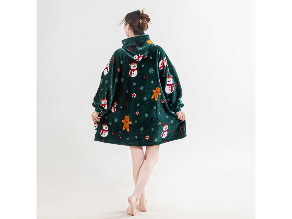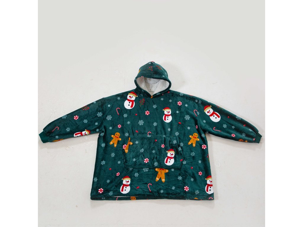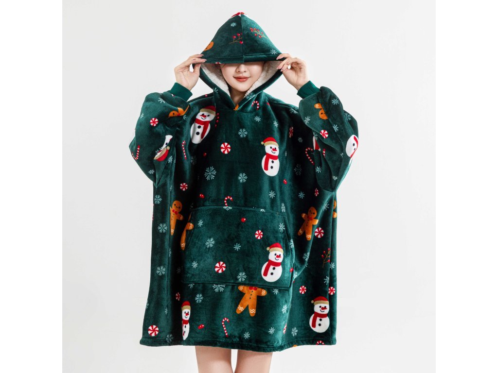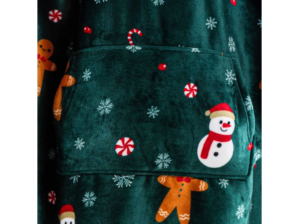 Sherpa-Kapuzen-Plaid mit Ärmeln SNOWMAN AND GINGERBREAD, grün