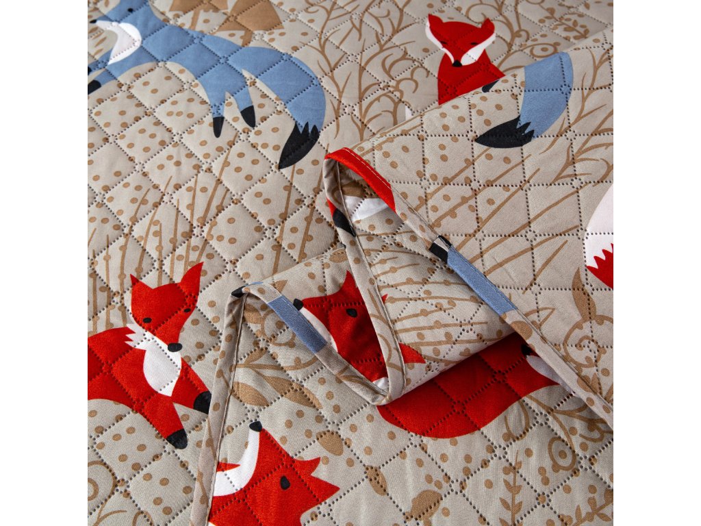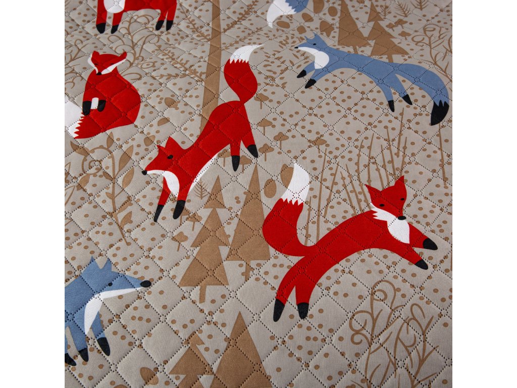 Tagesdecke mit Muster RED FOX in braunem produktdetails ist ein verspieltes und gemütliches Accessoire für Ihr Schlafzimmer. Die Kombination aus roten und blauen Füchsen auf warmem braunem Hintergrund schafft eine angenehme Atmosphäre, die gleichzeitig fröhlich und beruhigend wirkt.