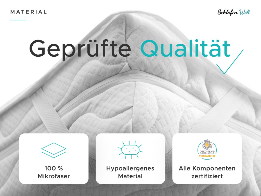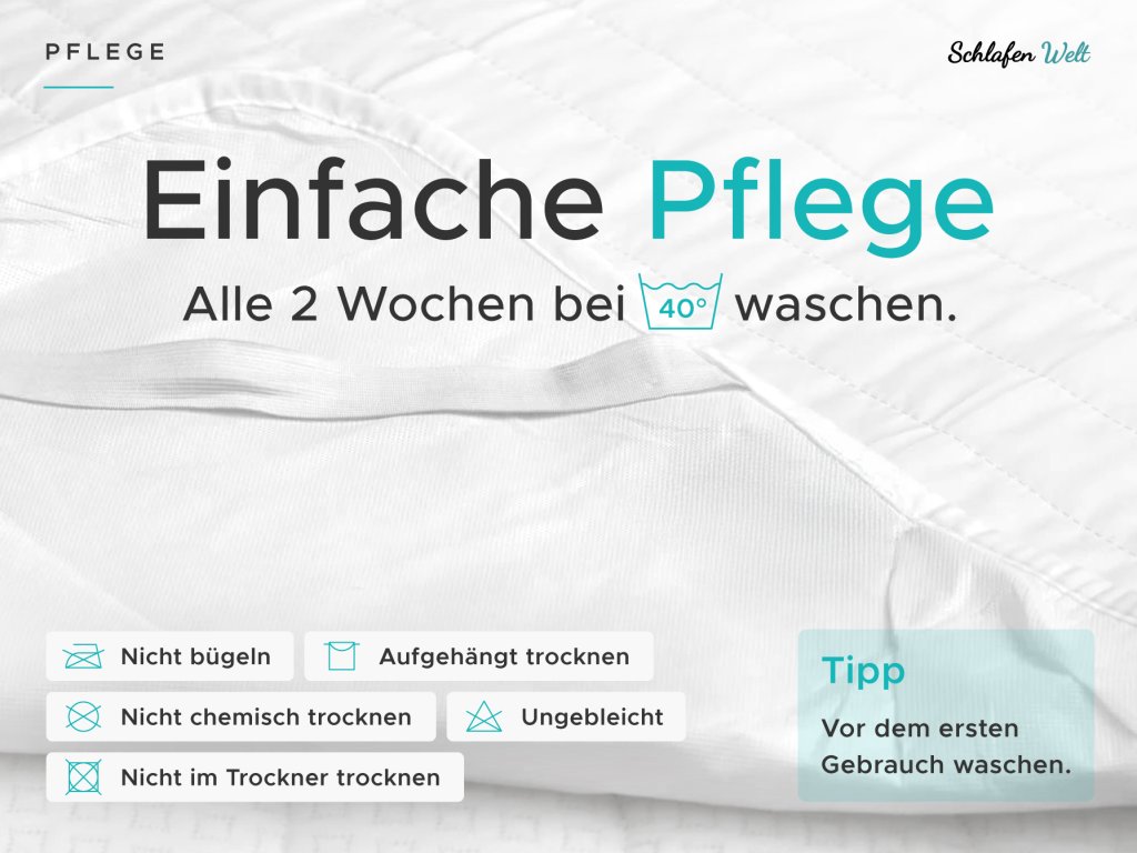 Die Pflege von Matratzenschonern ist denkbar einfach. Waschen und trocknen Sie den Schoner vor dem ersten Gebrauch gründlich. Um die gewünschten Eigenschaften, insbesondere die Dichtigkeit, zu erhalten, empfehlen wir eine Waschtemperatur von maximal 60 °C. Wenn Sie die Bettwäsche regelmäßig wechseln, waschen Sie auch den Schoner, idealerweise einmal alle 14 Tage. Nach dem Trocknen sollte der Matratzenschoner an der Luft trocknen, die Verwendung eines Wäschetrockners wird nicht empfohlen. Nicht auskochen, bleichen oder andere chemische Produkte verwenden. Die Oberschicht aus Mikrofaser muss nicht gebügelt werden. Nach dem Waschen und Trocknen ist es wieder hygienisch einwandfrei und einsatzbereit.