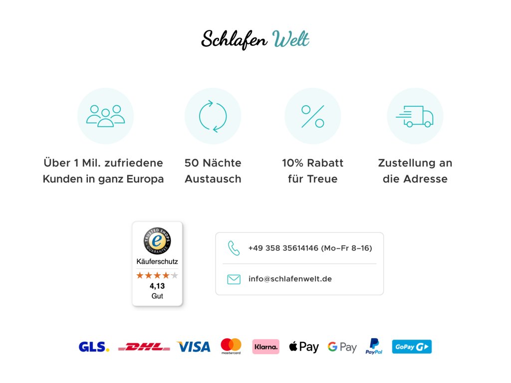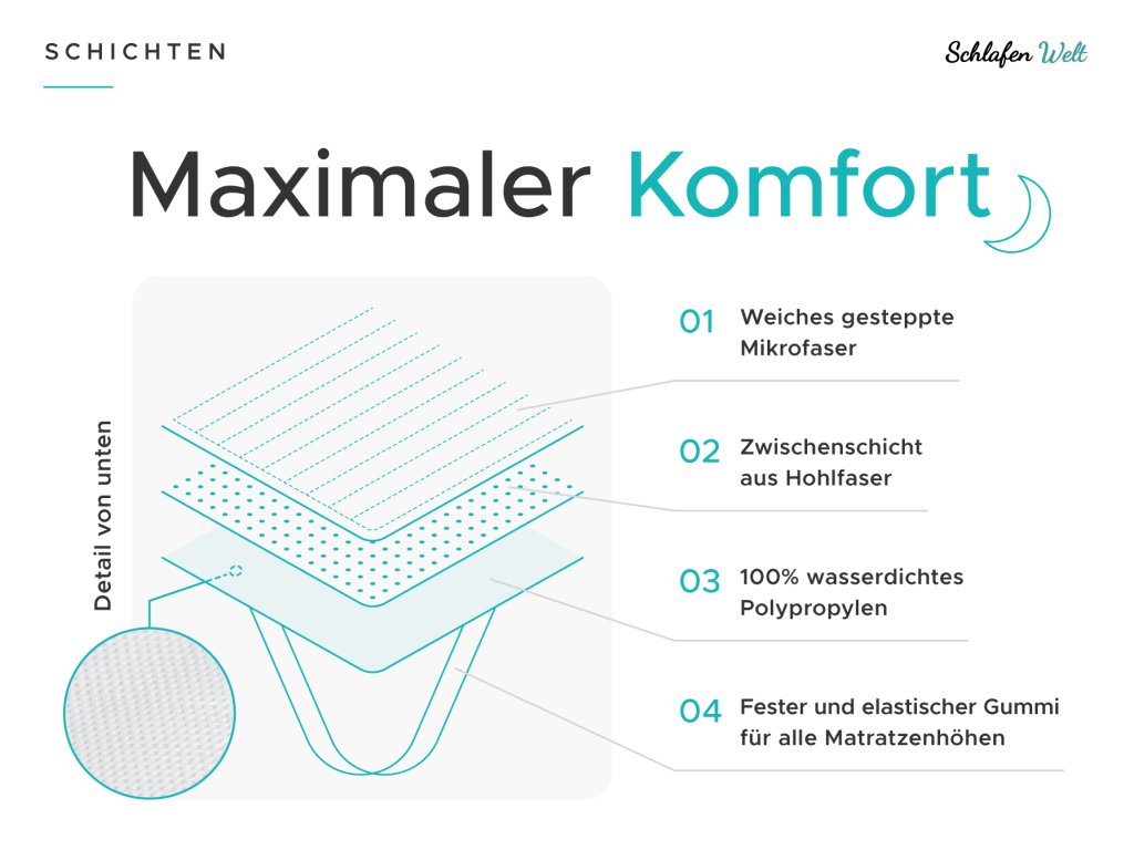 Matratzenschonerist wichtiger als Sie denken. Jeder Mensch, ob Kind oder Erwachsener, schwitzt von Natur aus. In der Nacht schwitzen wir bis zu einem Liter Schweiß, der in die Bettwäsche und den Matratzenkern eindringt. Der Matratzenschoner erhöht die allgemeine Hygiene des Bettes. Darüber hinaus schützt es vor mechanischen Beschädigungen, Schmutz, Milben, Schweiß und Urin. Dies ist ein großartiger Helfer für Kinderbetten oder erste Betten. Sie ist auch für Erwachsene als gewöhnlicher Matratzenschoner geeignet, für ältere Menschen oder für Personen, die lange bettlägerig sind. Der wasserdichte Matratzenschoner bildet eine schützende und flüssigkeitsdichte Schicht. Sie brauchen keine Angst zu haben, auf einer Plastikfolie zu schlafen, denn die oberste Schicht des Matratzenschoners besteht aus Mikrofaser, die sanft zur Haut ist und sich angenehm anfühlt.