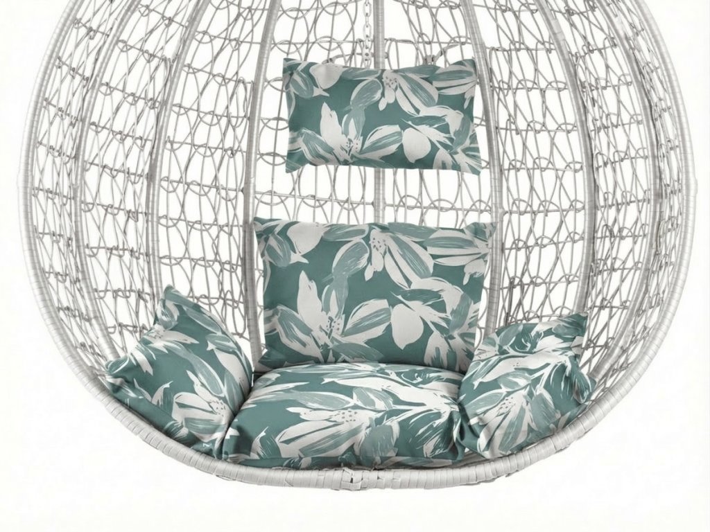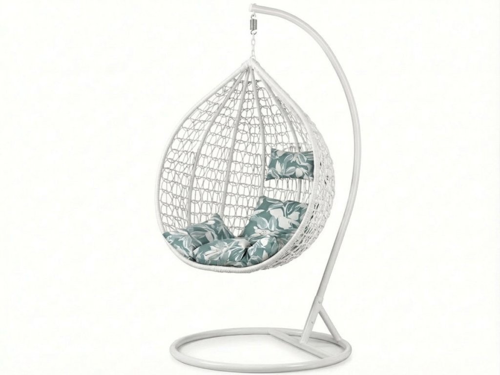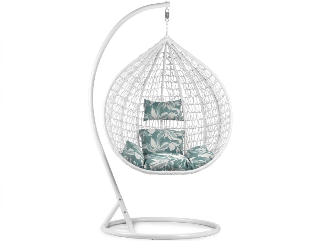 Weißer hängender Stuhl KOKON mit Gestell, grün-weißes Kissen