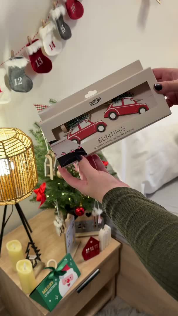 - An der Girlande sind 8 Stk. Holzautos aufgehängt