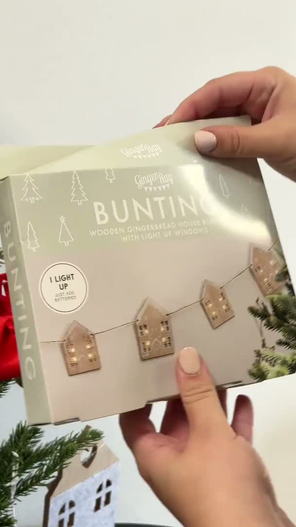 - An der Girlande sind 8 Stk. hölzerne Häuschen aufgehängt
