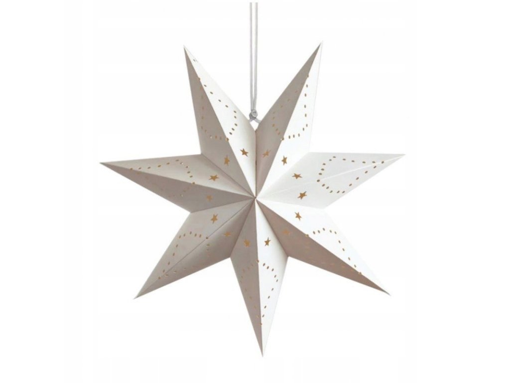 Weihnachtlicher Papierstern zum Aufhängen STARLET mit einem Durchmesser von 45 cm in weißem produktdetails ist eine schöne Dekoration, die sofort die zauberhafte Atmosphäre der Feiertage schafft. Dank des fein geschnittenen Musters wirkt er elegant und festlich. Der Stern ist leicht, einfach aufzuhängen und wird zu einem markanten Element Ihrer Weihnachtsdekoration.