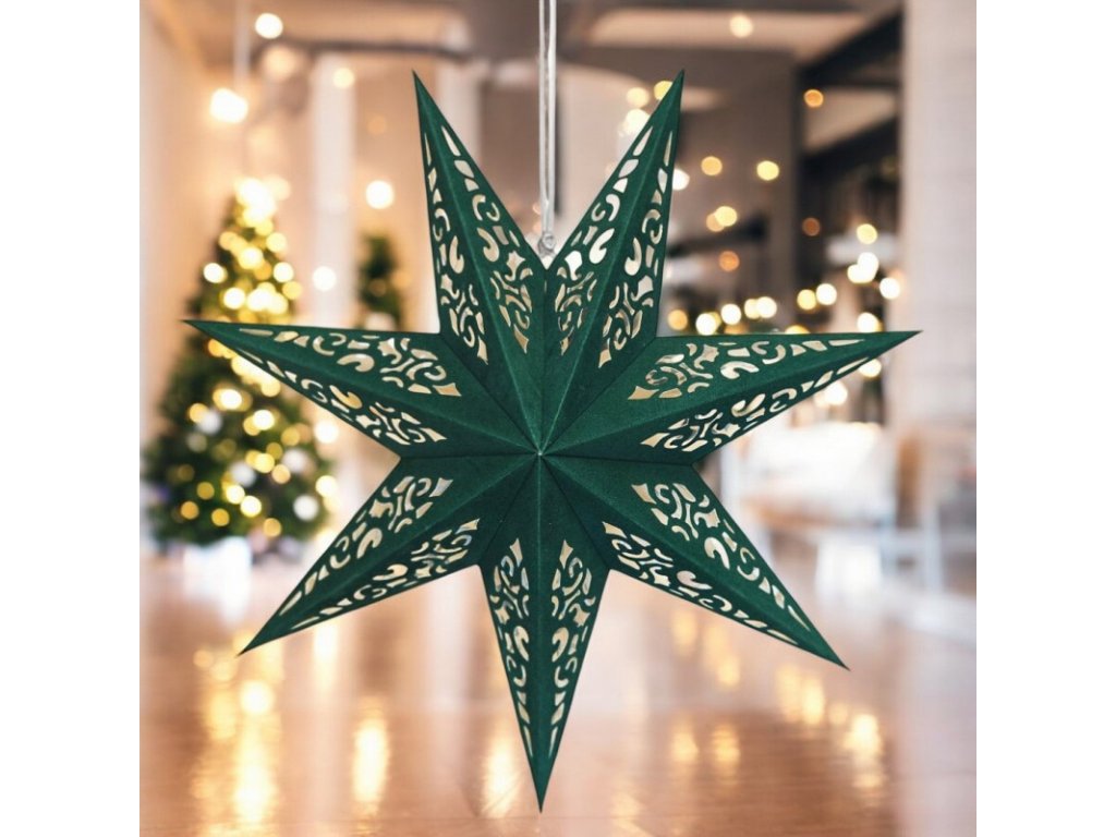 Weihnachtlicher Papierstern STARLET DELUXE mit einem Durchmesser von 35 cm in grünem Design ist eine schöne Dekoration, die sofort eine zauberhafte Weihnachtsatmosphäre schafft. Dank des fein geschnitzten Musters wirkt er elegant und festlich. Der Stern ist leicht, lässt sich einfach aufhängen und wird zu einem markanten Element Ihrer Weihnachtsdekoration.