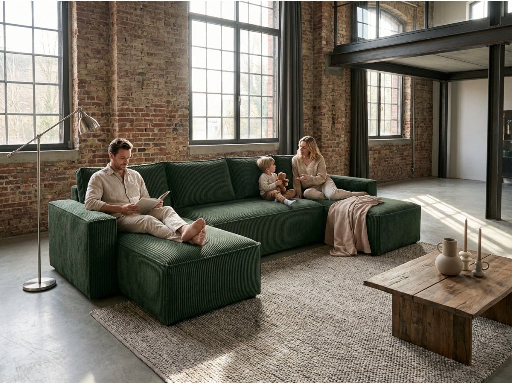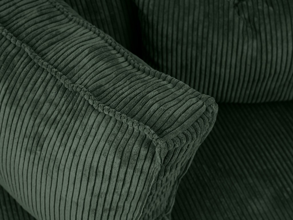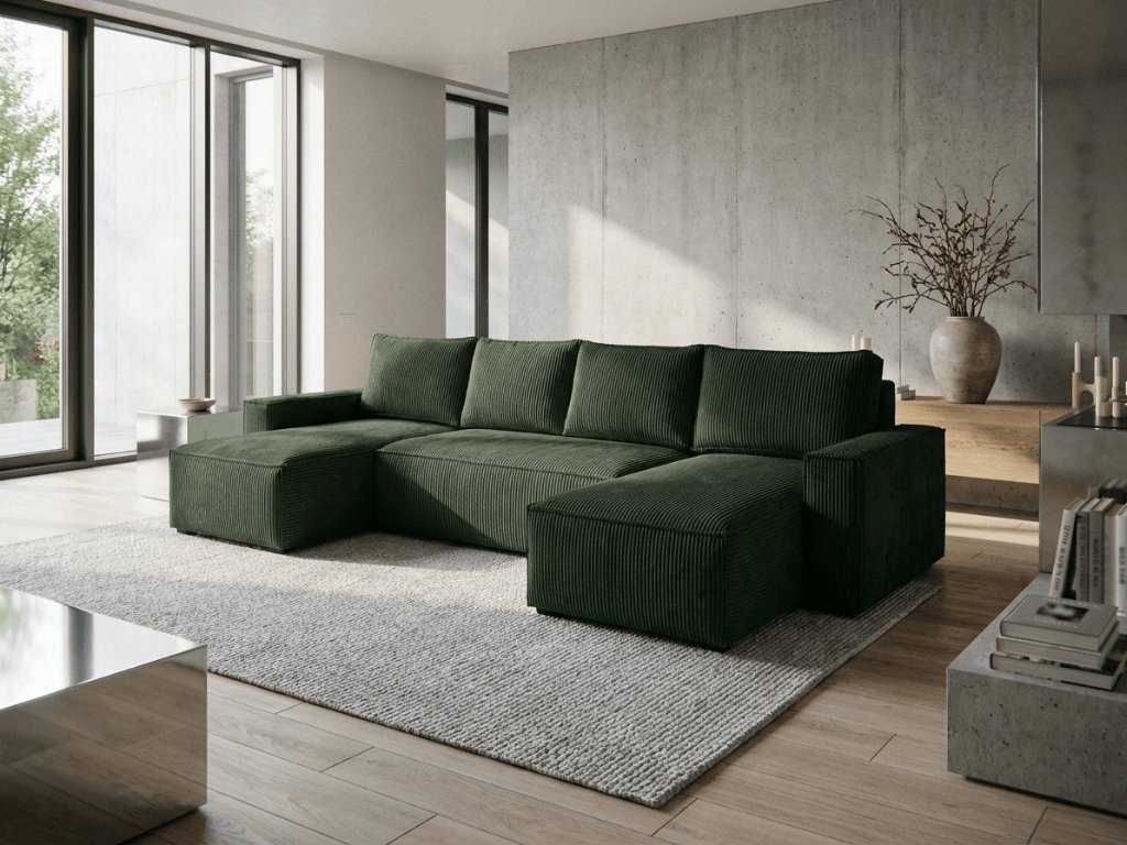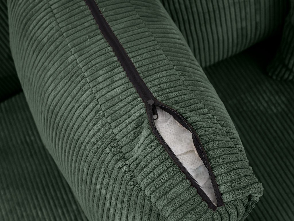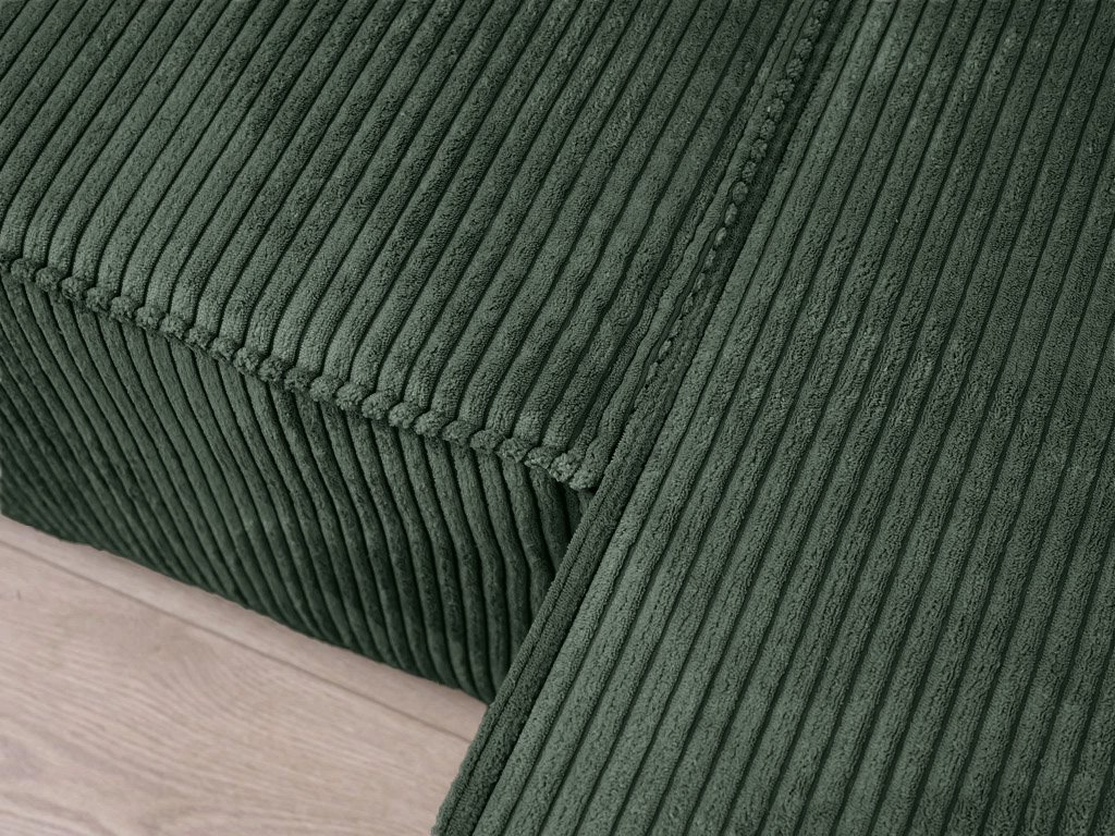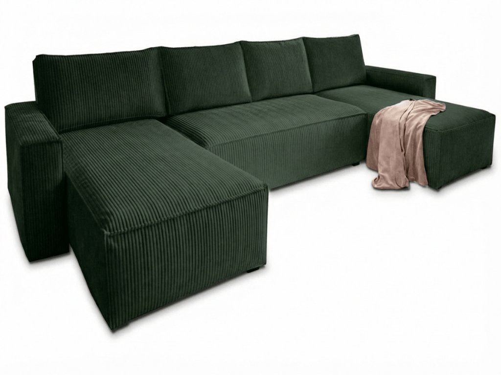 Die Dunkelgrüne U-förmige Sitzgarnitur SMART COSARO 295x140 cm in eleganter grüner Farbe ist eine großartige Wahl für diejenigen, die Komfort, Stil und Funktionalität in einem suchen. Der Kord-Look des Stoffes Poso verleiht dem Set einen einzigartigen Charme und ein angenehmes Gefühl beim Berühren. Dank der Abmessungen von 295 x 140 cm bietet sie ausreichend Platz für die ganze Familie und beeindruckt jeden, der Ihr Wohnzimmer betritt.